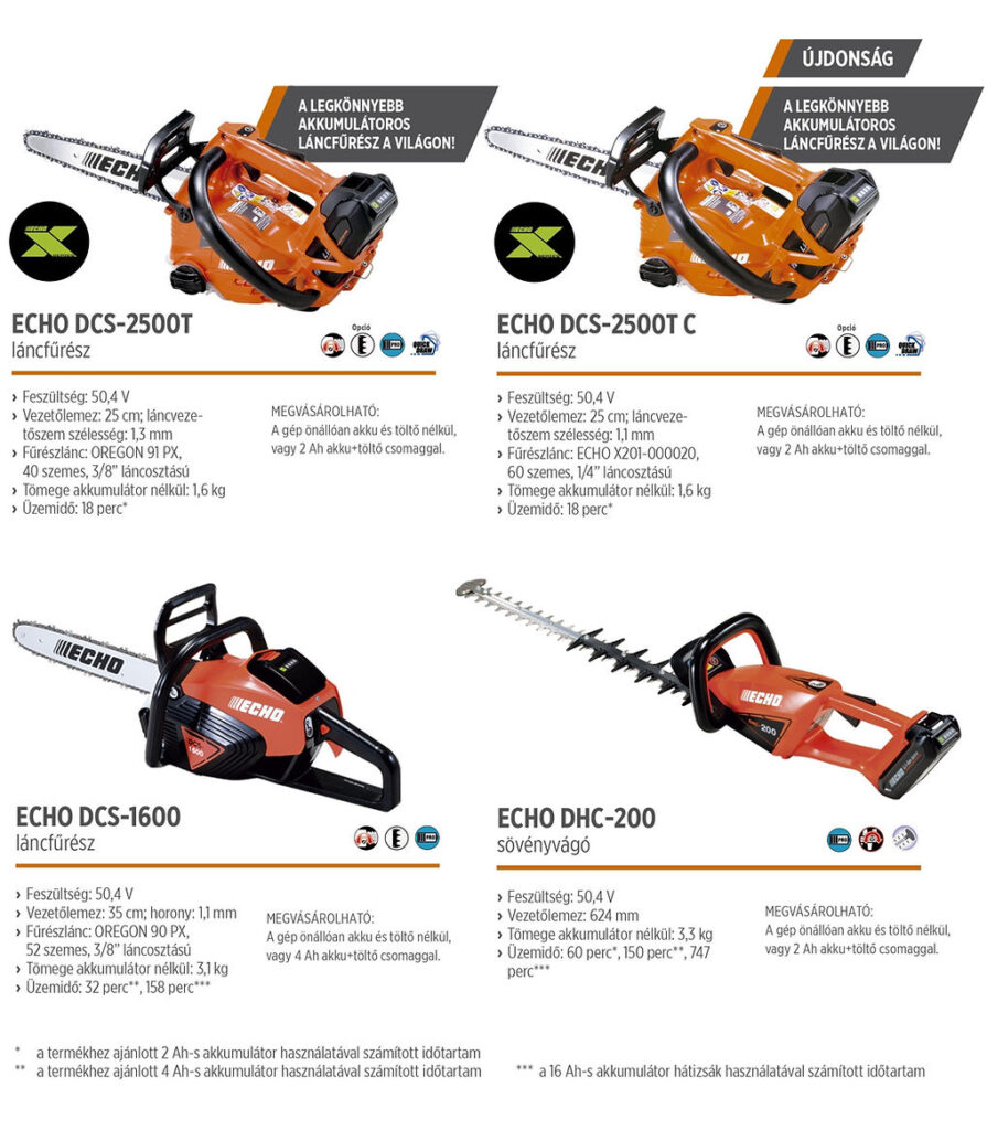 Az ECHO akkumulátoros gépei ugyanolyan szakmai szabványok szerint készülnek, mint benzines társaik, azzal a különbséggel, hogy ezeket a legfrissebb technológiára épülő Li-ION akkuk hajtják. Ezek az akkumulátorok hosszú üzemidővel dolgoznak, gyorsan tölthetők és kis súlyuk mellett a rendkívül hosszú élettartamuk. A Performance sorozat és a Garden+ sorozat ideális a gazdálkodóknak és a kiskerti felhasználóknak, míg a Professional sorozat azoknak a szakembereknek készül, akik napi szinten dolgoznak gépeikkel. Az ECHO akkumulátoros gépcsalád tagjai 0 emissziót produkálnak, minimális vibráció mellett elég csendesek ahhoz, hogy zajérzékeny területeken is használhatók legyenek. Akár biokertészetben, üvegházban is használhatók, vagy minden olyan helyen, ahol zavaró lehet egy hangos gép, esetleg nem megengedett a benzinfüst.