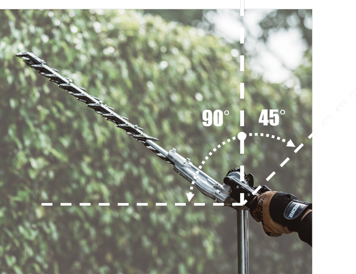 135°-ban Állítható Vágófej: A penge dőlésszöge egyetlen kézzel, fokozatokban állítható 135 fokos tartományban. Ez lehetővé teszi a sövények tetejének vízszintes vágását és az oldalfalak precíz alakítását is.